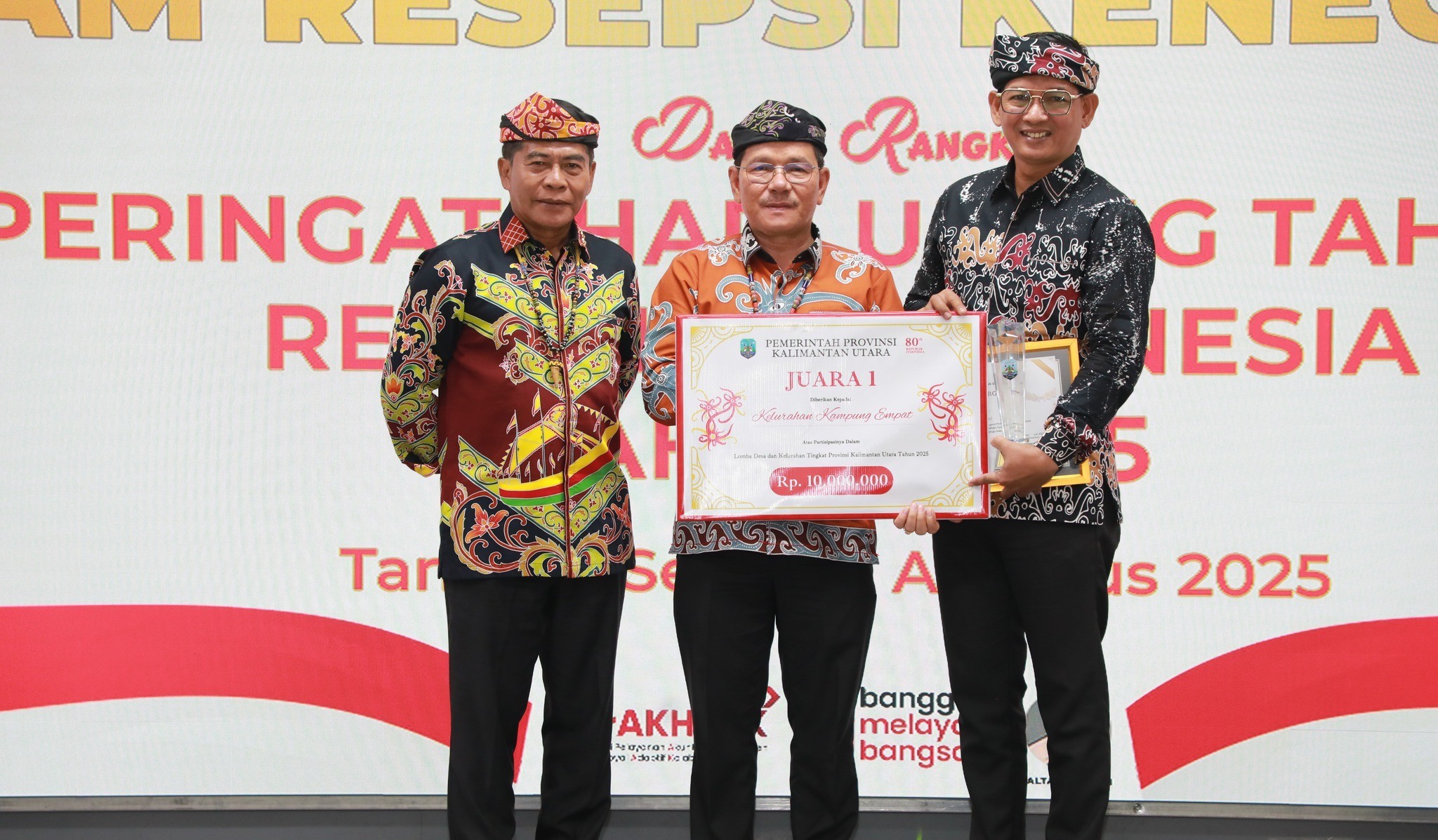 TANJUNG SELOR - Gubernur Kalimantan Utara, Dr. H. Zainal A. Paliwang, S.H., M.Hum dan turut didampingi Wakil Gubernur (Wagub), Ingkong Ala, S.E., M.Si. memberikan penghargaan kepada para juara Lomba Desa/Kelurahan, juara Lomba Inovasi TTG, dan juara Lomba TTG Unggulan Tingkat Provinsi Kalimantan Utara dalam rangkaian kegiatan Resepsi Kenegaraan Hari Ulang Tahun (HUT) ke-80 Kemerdekaan Republik Indonesia, di di Aula Lantai 1 Kantor Gubernur Kaltara (17/8/2025). Lurah Kampung Empat YUDHI, SH didampingi Kepala Bidang Pemberdayaan Masyarakat Dinas Sosial dan Pemberdayaan Masyarakat Kota Tarakan, AGUSTINA, SKM Menerima langsung Tropi, Piagam Penghargaan dan uang pembinaan Rp. 10.000.000,- sebagai juara 1 Lomba Kelurahan Tingkat Provinsi Kalimantan Utara tahun 2025 yang diserahkan langsung oleh Gubernur dan Wakil Gubernur Kalimantan Utara. "Semoga dengan penghargaan yang telah diberikan ini menjadi pemicu semangat, serta memotivasi Kelurahan Kampung Empat dan masyarakat di dalamnya untuk terus berinovasi dan berkontribusi dalam meningkatkan pembangunan di Kelurahan agar semakin maju dan berkembang. Berdasarkan hasil lomba, Desa dan Kelurahan Kampung Empat Kecamatan Tarakan Timur, Kota Tarakan akan mewakili Provinsi Kalimantan Utara pada Lomba Desa dan Kelurahan Tingkat Regional, dimana lomba Desa dan Kelurahan ini dilakukan secara berjenjang dan berkelanjutan yang dimulai dari tingkat Kecamatan, tingkat Kabupaten/Kota, tingkat Provinsi, hingga Pusat yang terbagi dalam beberapa regional yakni, Regional 1 (Sumatera), Regional 2 (Jawa, Bali), Regional 3 (Kalimantan, Sulawesi) serta Regional 4 (Papua, Nusa Tenggara, Maluku).